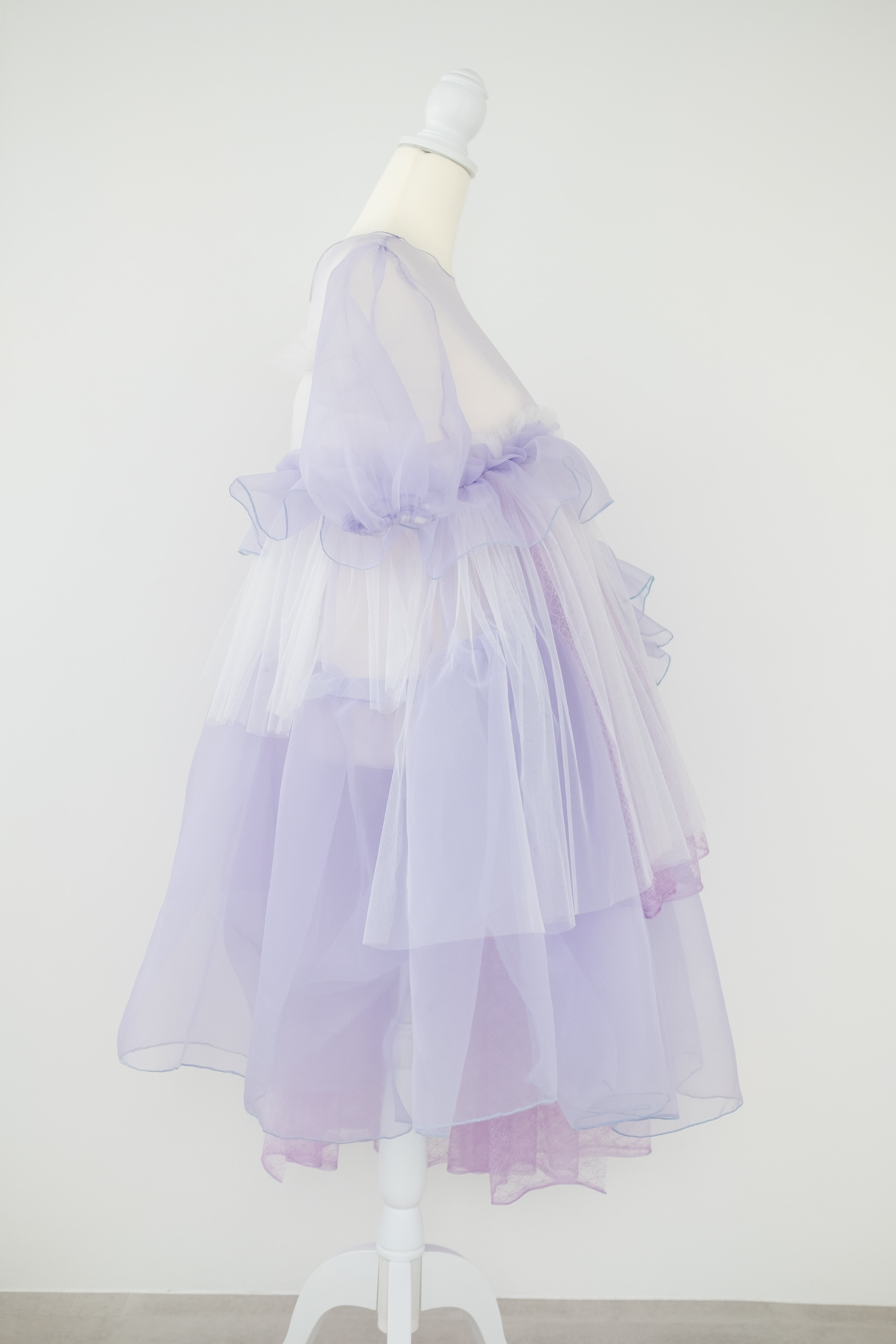 クラゲをイメージして製作した薄紫色のワンピース。アシンメトリーなデザインが個性的で、袖もスカートもボリューム感たっぷりに仕上げました。