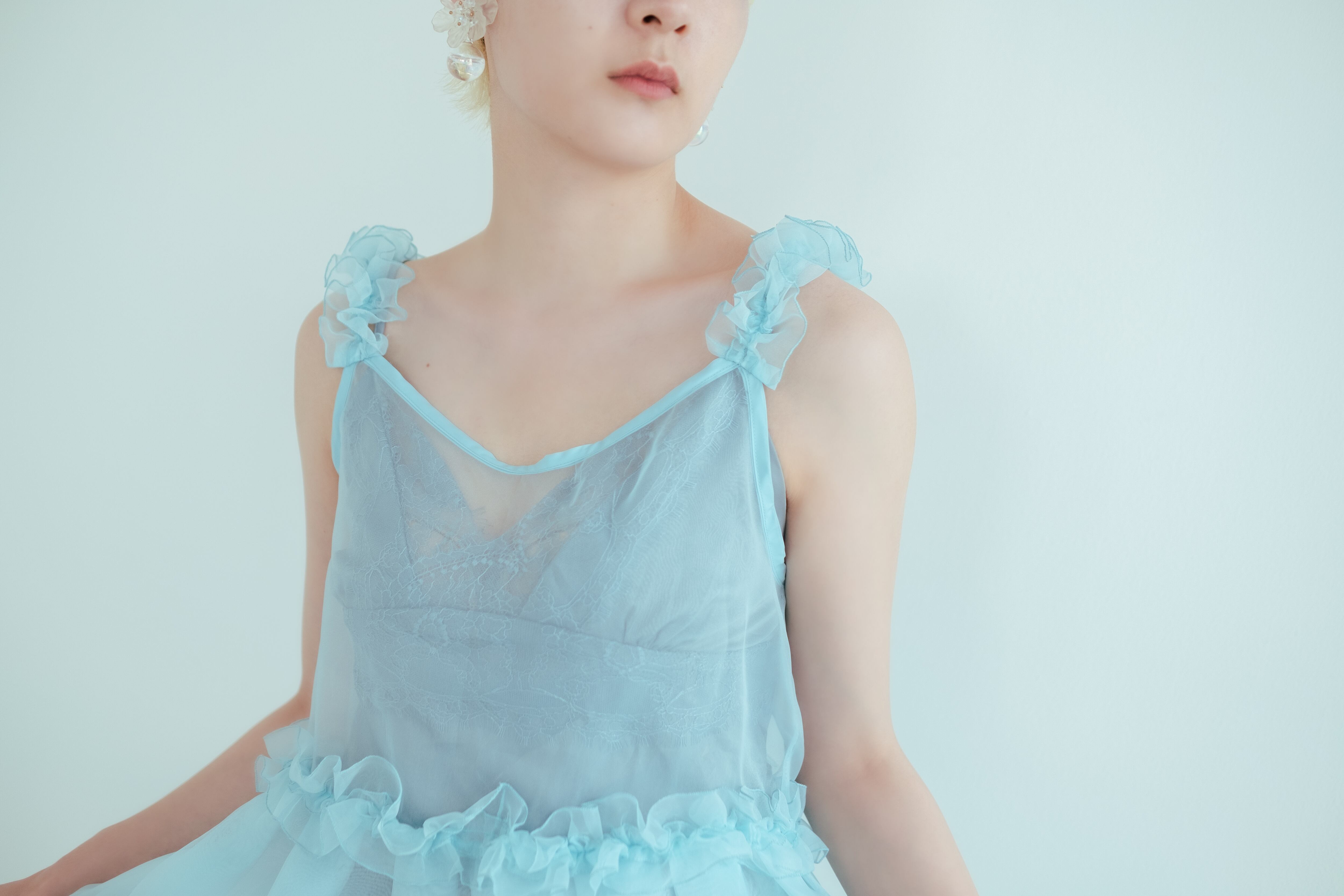 淡い水色が涼しげなロングワンピース。トップにはフリルが施されており、スカート部分は軽い生地を沢山使用しているため、空中での対空時間が長く風になびく様子が美しいです。