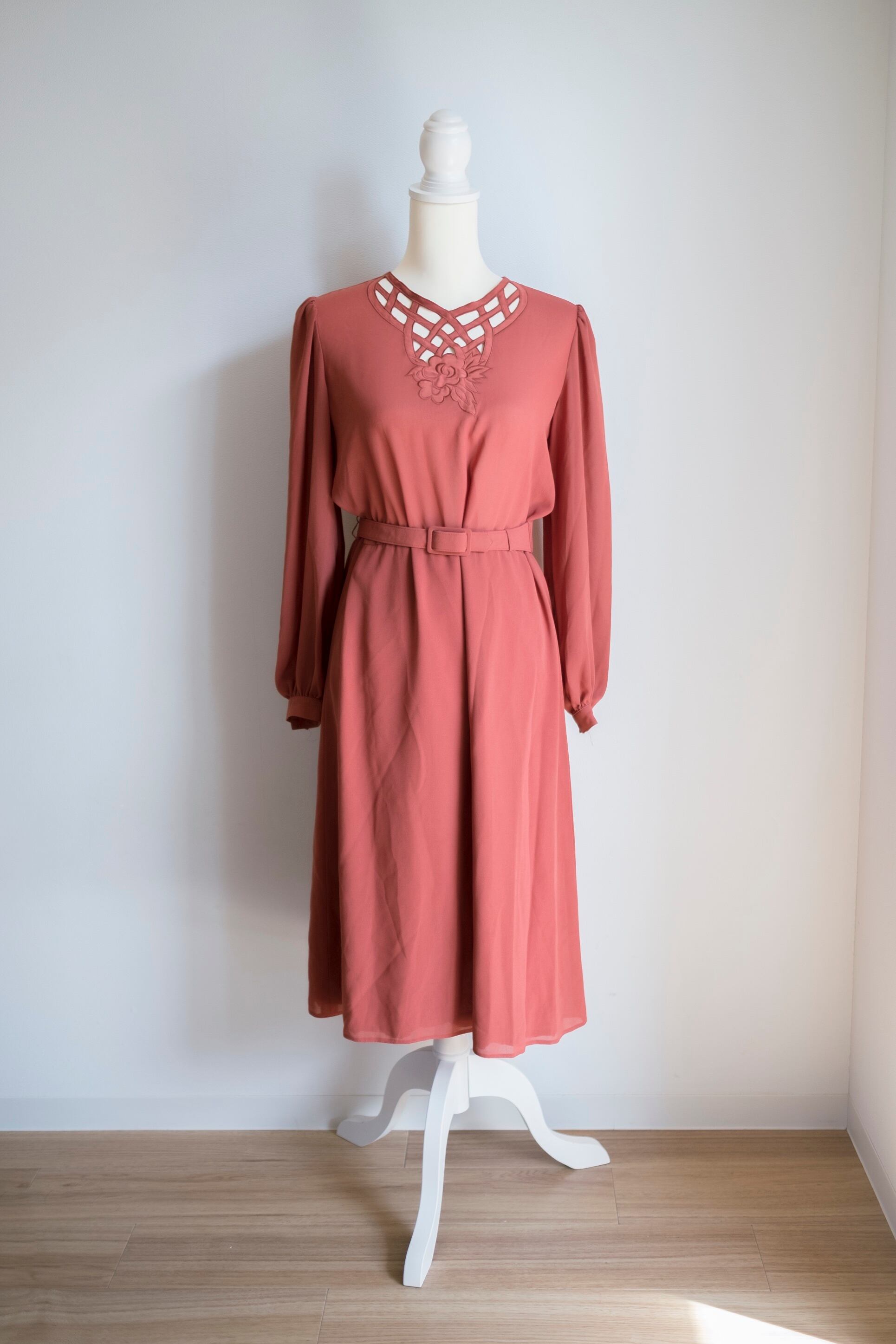 レンガ色と胸元のデザインが可愛い、すとんとしたシルエットのワンピースです。