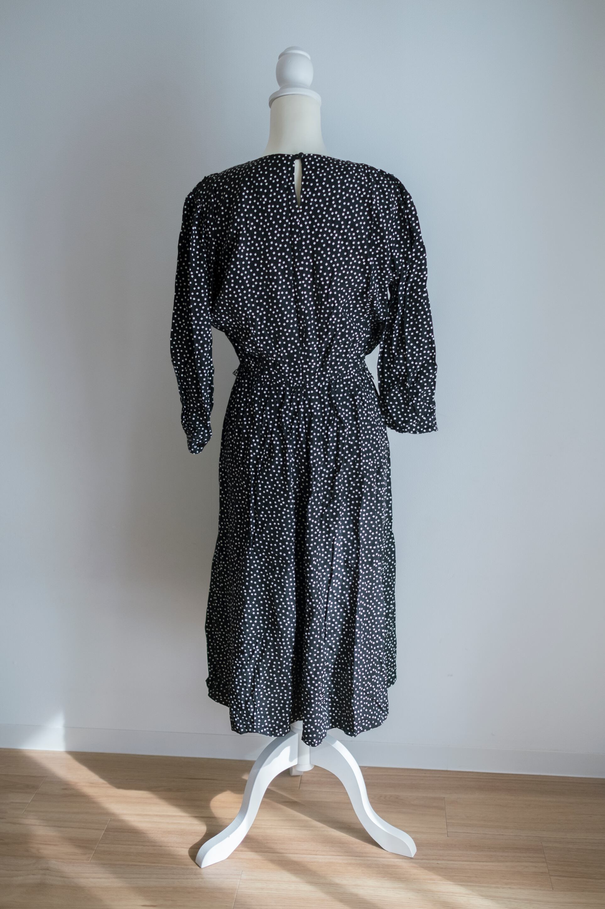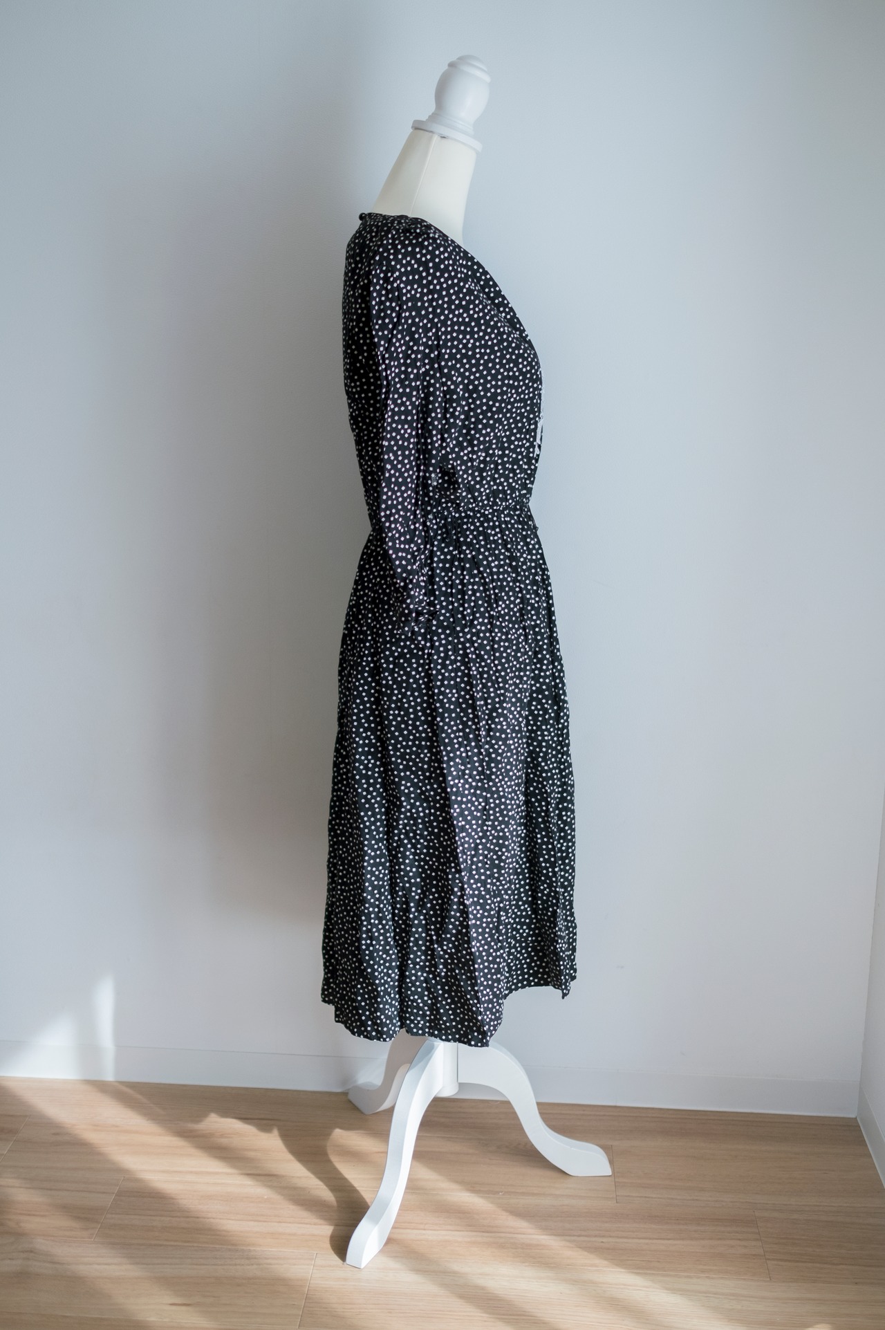 四角のドット柄ワンピースです。胸元はスクエア型でレースがポイントです