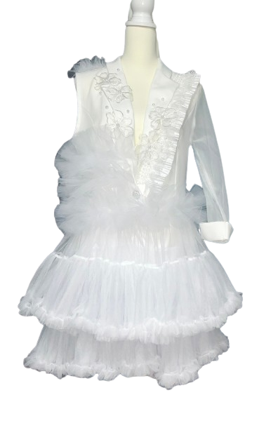 お花・パール・レースの装飾を散りばめました。アシンメトリーな袖がポイント。ふわりとした軽い生地のAラインスカートは、脚が綺麗に見えるのでおすすめです。