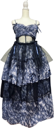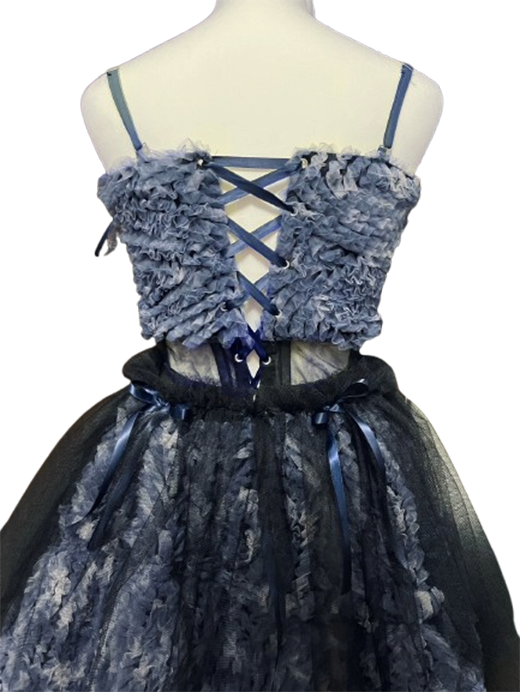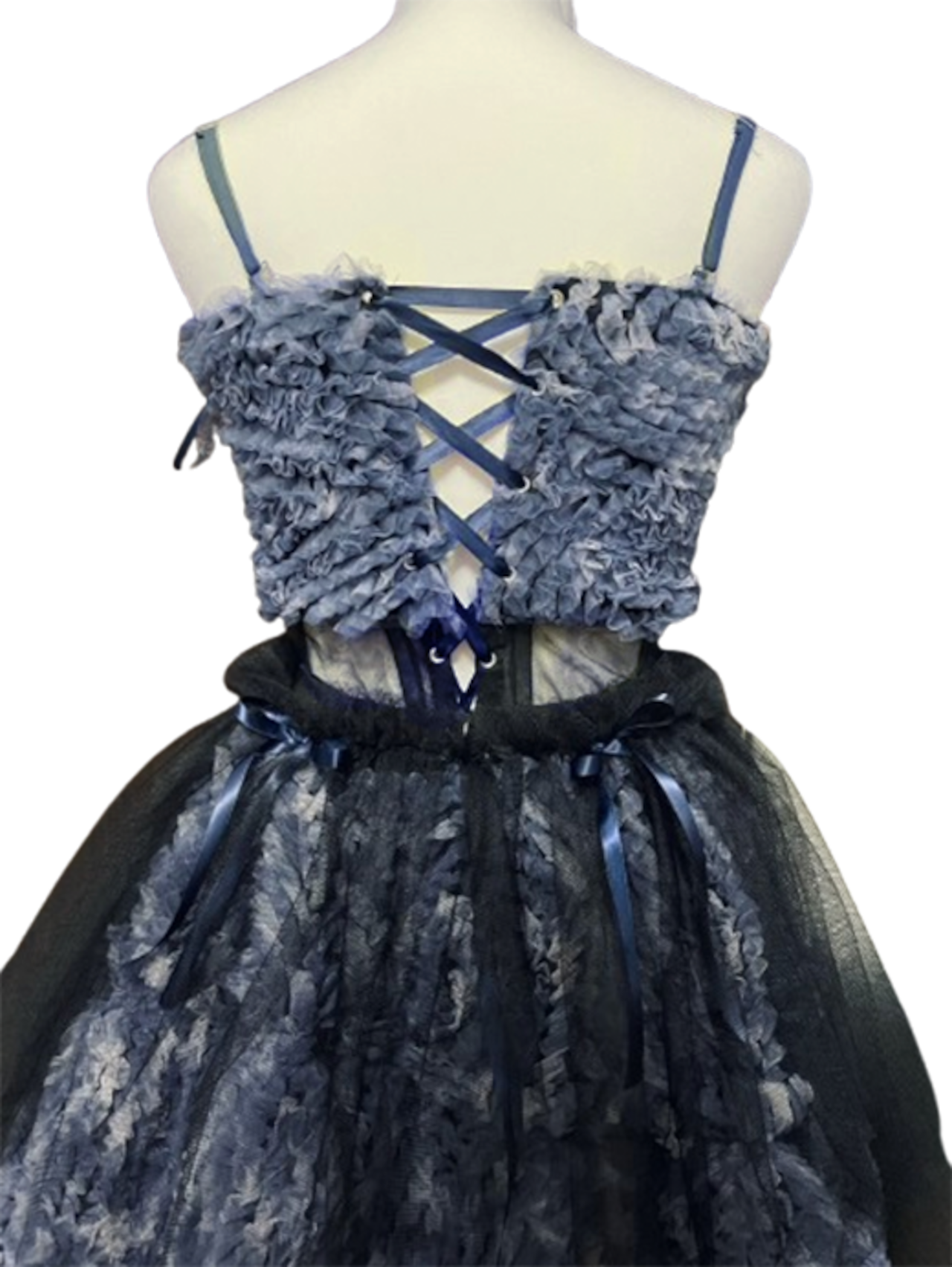 ふわふわのチュール生地で制作したくすみブルーとブラックのロングドレスです。