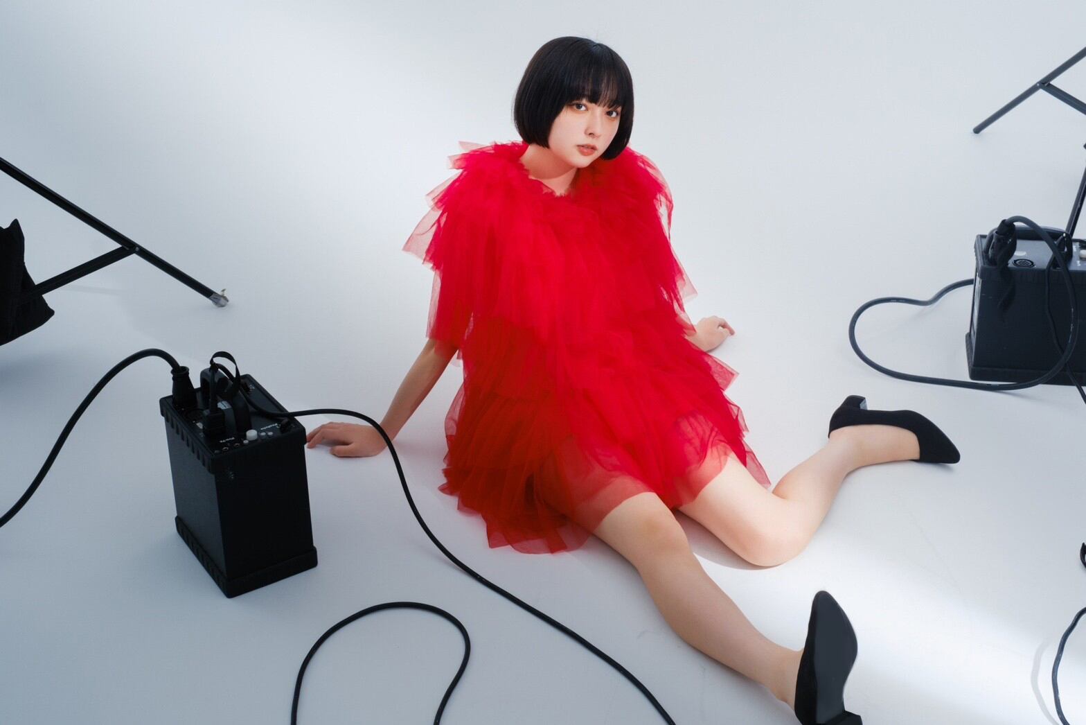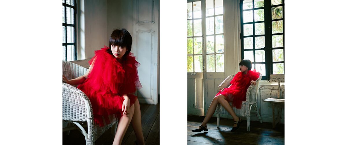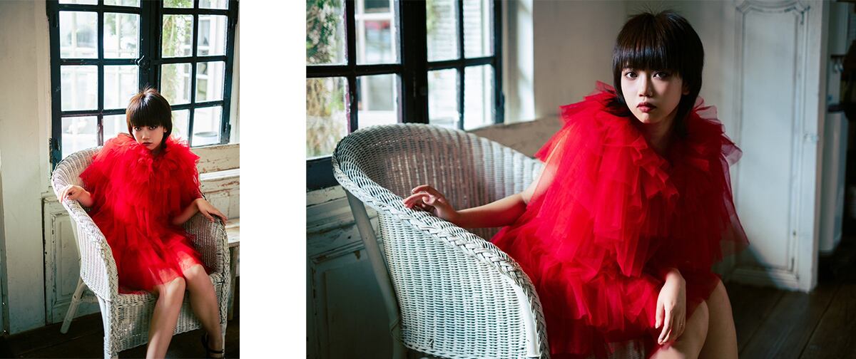 今回お借りしたのはレース素材で出来た赤い衣装。シンプルながらも幾重に重なった構造でボリューム感が出る衣装です。中に着るインナーを工夫することで背中を大体に見せたり、セクシーに見せる事もできます。スタジオにてストロボを使った撮影と、自然光での撮影2パターンに臨みました。両方注意したポイントとして衣装の生地が重なっている構造と生地感を損なわない事です。